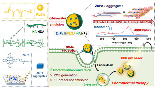 - Gao, D.; Wong, R.C.; Wang, Y.; Guo, X.; Yang, Z.; Lo, P.-C. Shifting the absorption to the near-infrared region and inducing a strong photothermal effect by encapsulating zinc (II) phthalocyanine in poly (lactic-co-glycolic acid)-hyaluronic acid nanoparticles. Acta Biomater. 2020, 116, 329–343. [Google Scholar] [CrossRef] [PubMed]