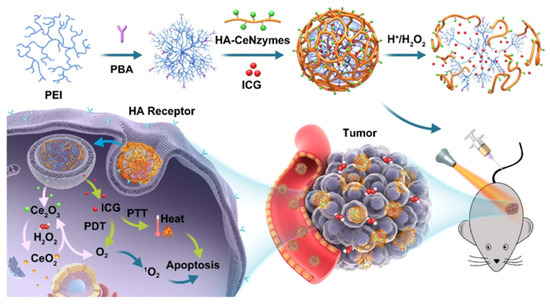 - Zeng, L.; Cheng, H.; Dai, Y.; Su, Z.; Wang, C.; Lei, L.; Lin, D.; Li, X.; Chen, H.; Fan, K. In vivo regenerable cerium oxide nanozyme-loaded pH/H2O2-responsive nanovesicle for tumor-targeted photothermal and photodynamic therapies. ACS Appl. Mater. Interfaces 2020, 13, 233–244. [Google Scholar] [CrossRef] [PubMed]