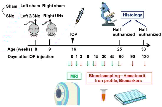 All experimental procedures and protocols involving animals were carried out in accordance with the institutional animal care committee of Taipei Tzu Chi Hospital and complied with the Guide for the Care and Use of Laboratory Animals (IACUC approval number: 109-IACUC-008). Twenty male C57BL/6 mice were divided into two groups, with 12 mice undergoing subtotal nephrectomy (SNx) and 8 mice undergoing sham operation. SNx surgery was induced in 8-week-old mice using a 2-step surgical nephrectomy procedure as previously described [12,22,23]. Briefly, mice were anesthetized, and the left kidney was exposed through an incision at the dorsal midline skin. Then, two of three branches of the left renal artery were ligated through a lateral incision. One week after the operation, the right kidney was removed after ligation of the renal blood vessels and ureter under anesthesia. Previous research suggests that using an iron sucrose-loaded rodent model through intraperitoneal administration can provide results that are comparable to those obtained through intravenous administration in humans [24]. Additionally, due to the small size of the tail veins in mice, repeated intravenous injections can be difficult to administer. We chose intraperitoneal IOP administration. According to the report of the previous phase 2 study, the recommended human dosage for IOP (MPB-1523) is 6 mg/kg. By applying the formula to determine the human equivalent dose for mice, this would translate to approximately 1.8 mg for a 25 g mouse. Therefore, each mouse was intraperitoneally administered a single dose of IOP at a volume of 90 µL, equivalent to 1.8 mg iron per kg of body weight. This administration was carried out seven weeks after SNx. Then, approximately 0.3 mL of blood was collected from the submandibular vein at 0, 3, 14, 30, 60, 90, and 120 days after IOP injection. Each blood sample was separated into a K2 EDTA tube for hematocrit measurement and a serum tube for iron parameter and ELISA measurements. The study protocol of IOP injection in sham and SNx mice was summarized in Figure 1.