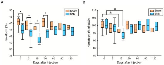 Effect of IOP injection on hematocrit in sham and SNx mice, (A) comparing its impact between the two groups and (B) assessing the time-dependent effect. * p < 0.05 compared with respective period of sham group. & p < 0.05 compared with its baseline level.