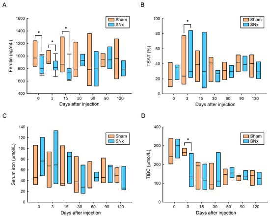 Effect of IOP injection on serum ferritin (A), TSAT (B), serum iron (C) and TIBC (D) in sham and SNx mice throughout the study. * p < 0.05 compared with respective period of sham group.