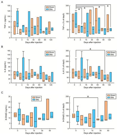Effect of IOP injection on serum TNF-α (A), IL-6 (B), serum 8-OHdG (C) in sham and SNx mice throughout the study. & p < 0.05 compared with its baseline level.