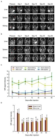 Serial T2 weighted MRI study of the SNx mice (A) and sham control mice (B) before and after IOP administration. MR images of three organs including liver, spleen and kidneys were illustrated. There is no visible organ damage after IOP administration. Significant liver signal intensity drop is observed after IOP administration. Quantitative measurement of the liver and renal signal intensity was illustrated (C). After the single dose of IOP delivery, the signal intensity of the liver elevated gradually which is more pronounced in the SNx group. There is no significant signal intensity change of the spleen in both groups. (D) Quantification of MR signal intensity of liver before and after single dose IOP injection in sham and SNx mice. & p < 0.05 compared with its baseline level before IOP injection. Data are expressed as mean ± SEMs.