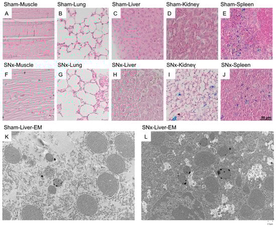 To identify IOP injection metabolism in SNx mice, specimens of skeletal muscle, lung, liver, kidney, and spleen from both sham control and SNx group mice were stained with Pearl’s stain (Figure 6A–J). The blue staining representing the presence of iron could be visualized at the splenic trabecula of both the sham and SNx groups. The liver hepatocytes did not show Pearl staining. Instead, the Kupffer cells of the sham control group showed blue iron staining (Figure 6C). There was significant blue staining in the kidney that had undergone surgery in the SNx group (Figure 6I). In addition, no histological changes in the organs were observed. We further studied the presence of IOPs by electron microscopy. Under 15,000× magnification, a trace number of black dots could be visualized at the vesicular-bound organelles of the liver in both the sham control and SNx groups. In addition, we also found pronounced Pearl staining in the sham control group in the liver and spleen (Figure 6C,E) compared with the SNx group (Figure 6J).