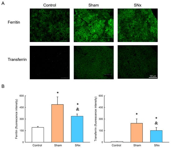 Representative images (A) and quantification (B) of immunohistochemistry of liver tissues from control, SNx and sham groups 60 days after IOPs delivery. Ferritin expression could be observed in both SNx and sham groups and there is stronger ferritin expression in sham group as compared to SNx group. Moreover, the transferrin expression was similar as the expression of ferritin in these three groups. * p < 0.05 compared with control group. & p < 0.05 compared with its sham group. Data are expressed as mean ± SEMs.