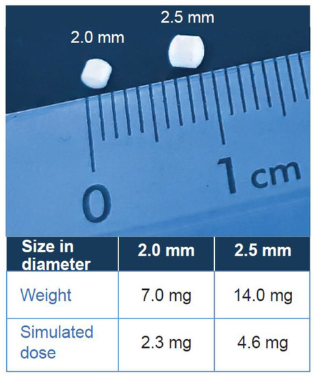 Drug-free mini-tablets. Simulated dose denotes the estimated amount of active drug that could be potentially administered in each mini-tablet size.