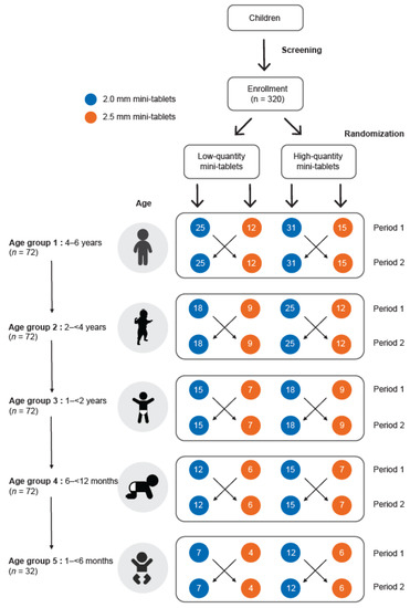Each group was randomized to two parallel arms to receive either a low or a high quantity of drug-free, film-coated, mini-tablets. The two quantities (high and low) for both mini-tablet sizes were tested in order to compare and evaluate the number of tablets that will be needed to cover the doses required for the age range that is being tested as the doses are calculated based on body weight. Children in each arm received the film-coated mini-tablets in two consecutive periods, Period 1, and Period 2. Within each arm, the 2.0 mm and 2.5 mm film-coated mini-tablet sub-groups were compared in a randomized cross-over fashion. The precise number of mini-tablets in the low- or high-quantity mini-tablet arm was determined by the child’s age, respectively (4–6 years: 25 vs. 12 or 31 vs. 15; 2–<4 years: 18 vs. 9 or 25 vs. 12; 1–<2 years: 15 vs. 7 or 18 vs. 9; 6–<12: 12 vs. 6 or 15 vs. 7, and 1–<6 months: 7 vs. 4 or 12 vs. 6). Variations in the number of tablets within the low or high quantity mini-tablet arms, allows an estimation of the expected dosage range for different age groups based on the World Health Organization (WHO) growth chart [16].
