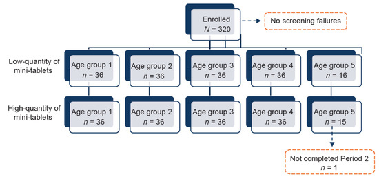 A total of 320 children across five age groups (stratified: 4–6 years, 2–<4 years, 1–<2 years, 6–<12 months, and 1–<6 months) were included in the study, with 72 participants in each age group and 36 per age group in each dosing arm (2.0 mm 2.5 mm mini-tablets), except age group 5; Figure 3. One child in group 5 was withdrawn after the first administration due to coughing and thus a total of 319 children completed the study.