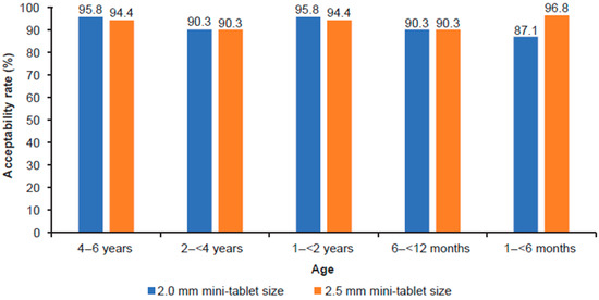 The EMA Guideline on pharmaceutical development of medicines for paediatric use [7] and the Reflection paper on formulations of choice for the pediatric population [18] recommend various factors such as route of administration, dosage form, dosing flexibility, and excipients in the preparation when investigating acceptability of pediatric formulations. Moreover, acceptability is fundamental to effective pharmacotherapy and is defined as the ability and willingness of a patient to use and its caregiver to administer the medicine as intended [7]. Findings from our study showed a high rate of overall acceptability for mini-tablet formulations across all age groups, including children as young as 6 months up to 6 years. These are in line with previous research on acceptability of pediatric formulations [9,10,11,12,13].