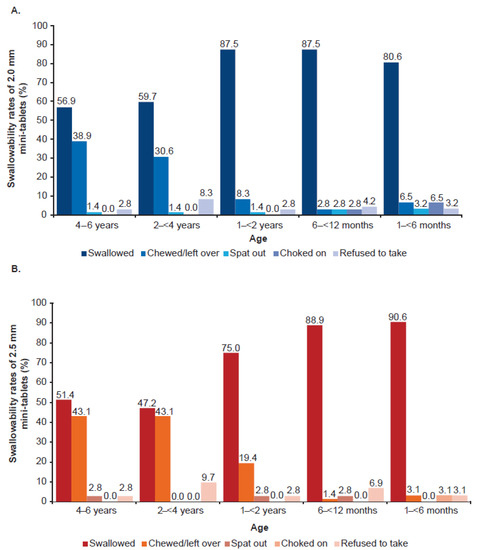 Swallowability of the film-coated mini-tablets was assessed in children aged 1 month to 6 years based on five criteria (Table 2). The majority of children in all age groups were able to swallow both 2.0 mm and 2.5 mm mini-tablets, with a higher swallowability rate observed in the younger age groups (1–<2 years, 6–<12 months, and 1–<6 months). In comparison, the proportion of children who chewed/leftover the mini-tablets were lower across younger age groups (1–<2 years, 6–<12 months, and 1–<6 months). The proportion of children who spat out, choked on, or refused to take the tablets were very low with both 2.0 mm and 2.5 mm mini-tablets. There were two children in the age group 6–<12 months (both cases were reported in the 2.0 mm mini-tablets), and three children in the youngest (1–<6 months) age group (two cases were reported with the 2.0 mm mini-tablets and one was with the 2.5 mm mini-tablets) who coughed during study drug administration and were assessed as “choked on”, leading to discontinuation of recruitment in the youngest age group (Figure 5A,B).