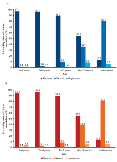 The palatability of the mini-tablets was generally rated as “pleasant” in the majority of children in age groups 1–<2 years, 2–<4 years, and 4–6 years, whereas palatability in the younger age groups (6–<12 months, and 1–<6 months) had mostly neutral ratings. An unpleasant reaction to the administration of both tablet sizes was found in less than 10% of the children in all age groups (Figure 6A,B).