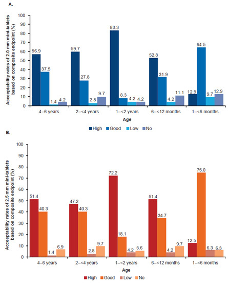 Acceptability rates as composite endpoint of swallowability and palatability by age group and (A) 2.0 mm and (B) 2.5 mm mini-tablet sizes. n = 36 per age group in each dosing arm, except 1–<6 months group, where n = 15 in 2.0 mm and n = 16 in 2.5 mm dosing arm.