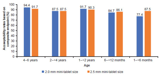 Acceptability determined by the composite endpoint of swallowability and palatability, derived from high and good acceptability results. n = 36 per age group in each dosing arm, except 1–<6 months group, where n = 15 in 2.0 mm and n = 16 in 2.5 mm dosing arm.