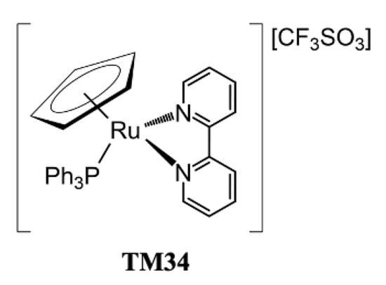The group of Ru(II) organometallic compounds has also drawn much attention in the medicinal chemistry field, presenting promising anticancer activity both in vitro and in vivo. The most studied organoruthenium compounds are those with a piano stool configuration based on a Ru(II)-(η6-C6H6) core [,]. However, another promising group of piano-stool-structured compounds designated as Ru(II)-cyclopentadienyl complexes (RuCp), based on Ru(η5-C5H5) derivatives, is also gaining attention due to their recognized anticancer potential [,].