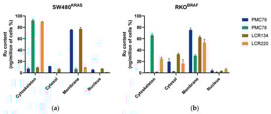The intracellular distribution of the Ru compounds was evaluated in CRC cells. Cytoskeletal, cytosol, membrane, and nucleus fractions were extracted using a commercial kit, as described in the Experimental Section. As shown in Figure 3, PMC79 and LCR134 are preferentially distributed in the membrane fraction in both CRC cell lines. On the other hand, PMC78 is mainly located in the cytoskeleton. Concerning LCR220, this compound is found in the cytoskeleton of SW480 cells, while in the RKO cell line, LCR220 is located in the membrane fraction.