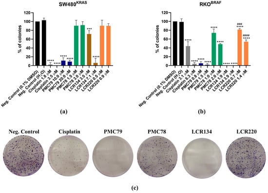 With respect to cisplatin, this drug reduced the ability of CRC cells to form colonies in both cell lines, in a similar way to PMC79 and LCR134 (Figure 4). This is a promising result since cisplatin is one of the most commonly used chemotherapeutic agents in clinics, although it can cause severe side effects and acquisition of resistance [].
