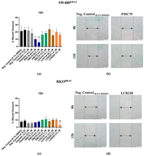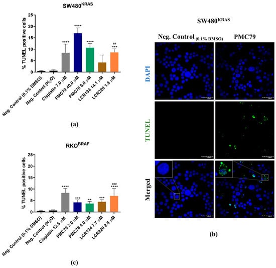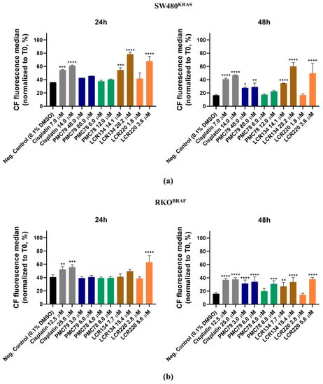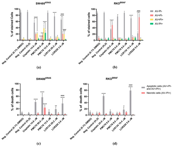 For the RKO cells, only cisplatin (12.5 μM and 25.0 μM), LCR134 (15.4 μM), and LCR220 (5.6 μM) compounds significantly induced apoptosis (Figure 8b,d and Figure A5b,d). Importantly, compared to cisplatin, the PMC79 and LCR220 compounds induced higher levels of apoptosis in SW480 and RKO, respectively. On the other hand, PMC78 did not induce apoptosis in any of the cell lines, even at the highest dose.