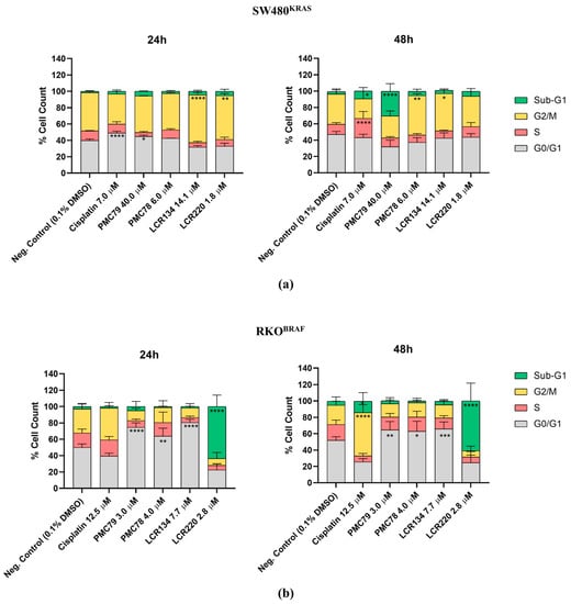 In the SW480 cell line, PMC78 led to an accumulation of cells in the G2/M phase only after 48 h. LCR134 also led to a cell cycle arrest in the G2/M phase after 24 h and 48 h (Figure 6a and Figure A4a). Regarding PMC79, we observed an increase in the percentage of cells in the G0/G1 phase, indicating an arrest in the cell cycle at 24 h, which resulted in an increase in the percentage of cells in the sub-G1 after 48 h of incubation. This alteration in the cell cycle distribution after 48 h of exposure to the PMC79 compound indicates an increase in the number of dead cells. On the other hand, the substantial increase in the percentage of cells in the G2/M phase that was observed at 24 h after exposure to LCR220 did not lead to changes in the cell cycle distribution at 48 h. This indicates that the cells were able to recover from the damage caused by the compound at the first time point. Cisplatin treatment also led to alterations in the cell cycle distribution. After 24 h of treatment, an increase in the percentage of cells in the G0/G1 phase was observed. However, after 48 h, cisplatin exposure caused an increase in the number of cells in the S phase and sub-G1.