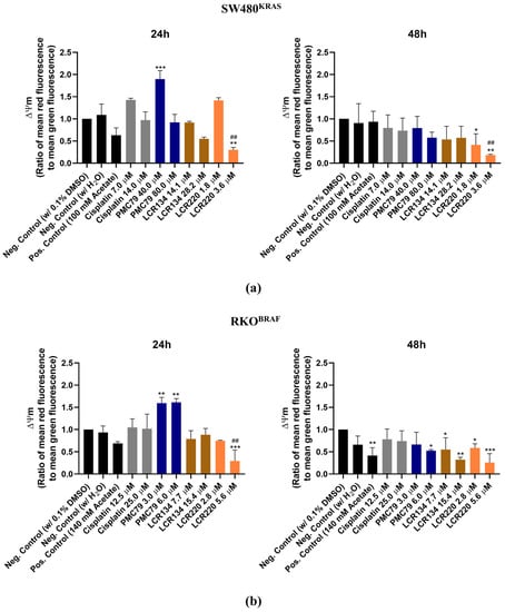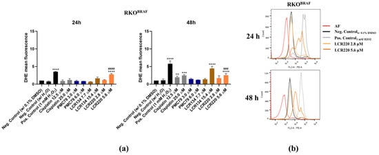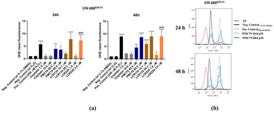 The cells were seeded in 6-well plates and after 24 h were incubated with PMC79, LCR134, and LCR220. Hydrogen peroxide (H2O2) (250 μM and 1 mM for the SW480 and RKO cell lines, respectively) was used as the positive control. The negative control cells were treated as described in Section 2.6. After 24 h and 48 h, both floating and attached cells were collected, washed with PBS, centrifuged at 2000 rpm for 5 min, and incubated with 500 nM Dihydroethidium (DHE) (30 min, 37 °C, in the dark) to detect superoxide anion (O−2). The fluorescence emission of the oxidized DHE was analyzed using flow cytometry. The results were evaluated using FlowJo 10.7.2 software.