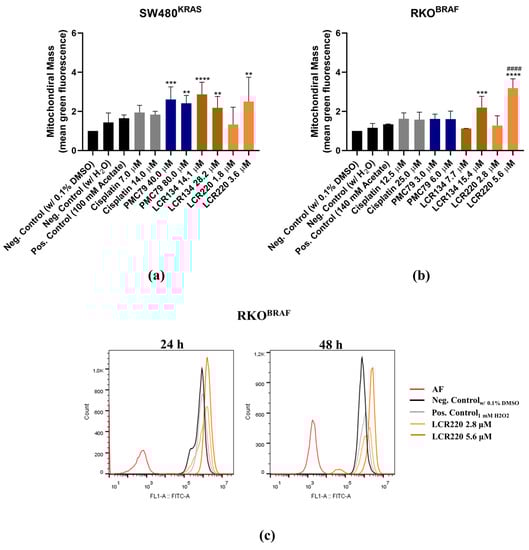The cells were processed as mentioned in Section 2.11. MitoTracker GreenFM (Molecular Probes, Eugene, OR, USA) was used to analyze the relative mitochondrial mass and MitoTracker Red CMXRos (Molecular Probes, Eugene, OR, USA) was used simultaneously to monitor the changes in mitochondrial membrane potential (ΔΨm). The cells were stained with 200 nM MitoTracker GreenFM and 200 nM MitoTracker Red CMXRos (30 min, 37 °C, in the dark). Sodium acetate (100 mM and 140 mM for the SW480 and RKO cell lines, respectively) was used as the positive control because it causes mitochondrial dysfunction, as previously observed by our group []. The fluorescence emission was analyzed using flow cytometry. The values of the mitochondrial mass were expressed as the mean green fluorescence intensity normalized to the correspondent negative control (w/0.1% DMSO). The values of ΔΨm for each time point were expressed as the ratio between the mean red fluorescence intensity and the mean green fluorescence intensity normalized to the correspondent negative control (w/0.1% DMSO). The results were evaluated using FlowJo 10.7.2 software.