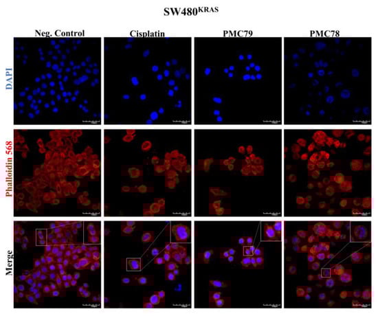 The cell lines SW480 and RKO were seeded in 12-well plates with one coverslip per well. 24 h after seeding, the treatments were processed as described in Section 2.6. 48 h later the cells were fixed and stained as previously reported by us []. Representative images were obtained using a fluorescence microscope (Olympus motorized BX63F Upright Microscope) at a magnification of 600×.