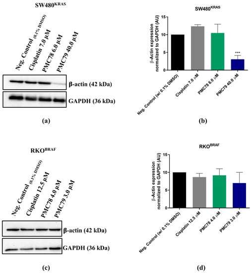 LCR134 and LCR220 do not affect the levels of β-actin in SW480 and RKO cell lines. Representative blots of β-actin expression for SW480 (a) and RKO (c) and analysis of quantification (b,d). Data are presented as mean ± SD from at least three independent experiments.
