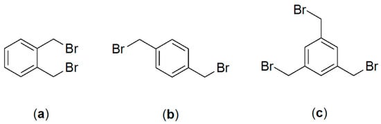Structure of the used rigid scaffolds: (a) 1,2-bis(bromomethyl)benzene (orto BBMB), (b) 1,4-bis(bromomethyl)benzene (para BBMB), (c) 1,3,5-tris(bromomethyl)benzene (TBMB).