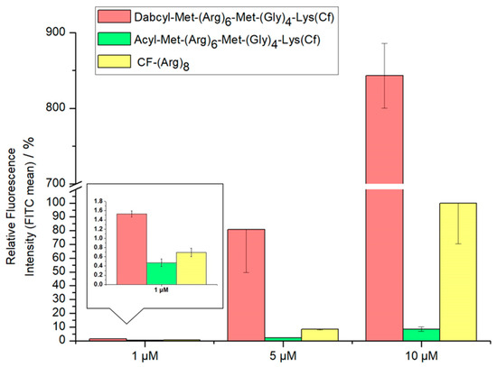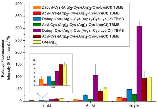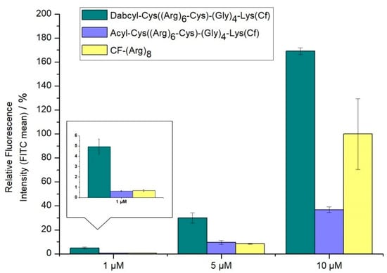 In the next step, the effect of cyclization on internalization was examined (Figure 3). The cyclic peptide was formed via a disulfide bond. The cyclic peptide (Acyl-Cys((Arg)6-Cys)-(Gly)4-Lys(Cf)) showed better cellular uptake than the linear peptide (Acyl-Met-(Arg)6-Met-(Gly)4-Lys(Cf)), and it had the same or almost half efficiency than the octaarginine at 5 and 10 µM concentrations, respectively. The Dabcyl group had internalization-enhancing ability in the case of this cyclic peptide (Dabcyl-Cys((Arg)6-Cys)-(Gly)4-Lys(Cf)), too. This derivative had 1.5–2 fold higher cellular uptake than the octaarginine.