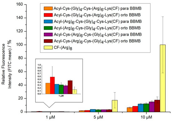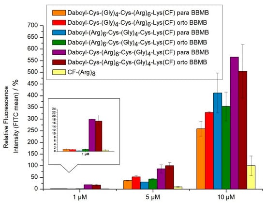 The attachment of the Dabcyl group to these cyclic peptides with aromatic scaffold enhanced dramatically their cellular uptake (15–25 fold increase) (Figure 5). All peptides were more efficient than the octaarginine (3–6 fold higher uptake). Two peptides (Dabcyl-Cys-(Arg)6-Cys-(Gly)4-Lys(Cf) para BBMB and Dabcyl-Cys-(Arg)6-Cys-(Gly)4-Lys(Cf) orto BBMB) had outstanding internalization ability at all concentrations, and they were very active at low concentrations (1 and 5 µM). In these constructs, the hexaarginine was in the cycle. If its position was changed, there was a small decrease in the cellular uptake independently of that at the N- and C-terminus of the structure.