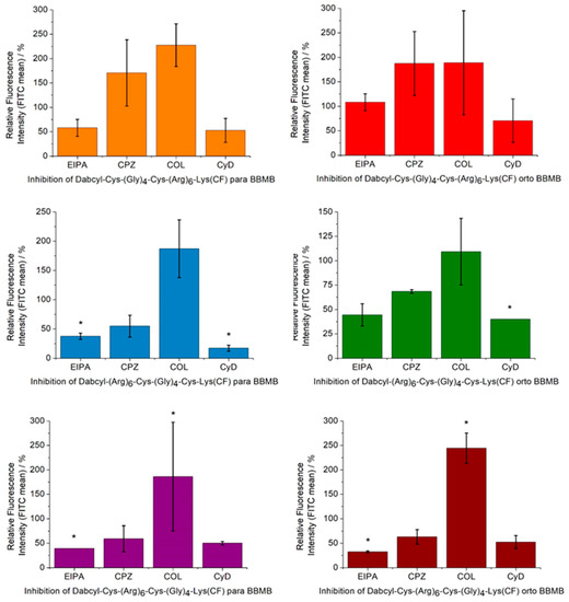The treatment with EIPA and CyD significantly reduced the uptake of the peptides. There is one exception, the Dabcyl-Cys-(Gly)4-Cys-(Arg)6-Lys(Cf) orto BBMB. In that case, the EIPA did not have an effect on the cellular uptake. The CPZ inhibits only the Dabcyl-Cys-(Arg)6-Cys-(Gly)4-Lys(Cf) orto and para BBMB and Dabcyl-(Arg)6-Cys-(Gly)4-Cys-Lys(Cf) orto and para BBMB. The treatment with COL did not inhibit cellular uptake.