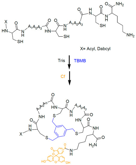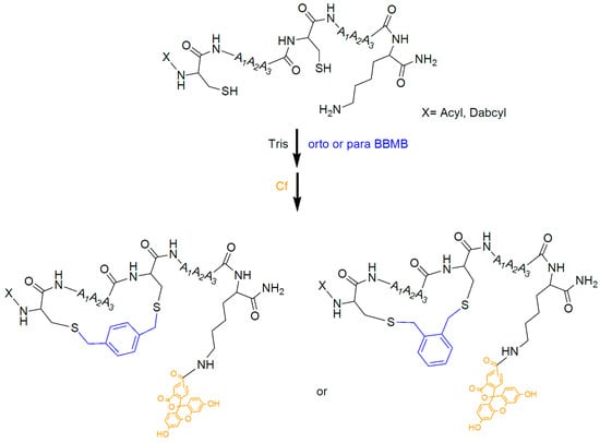 In this work, monocyclic and bicyclic peptides were designed to study the effect of cyclization on oligoarginines internalization. Therefore, all peptides contain cysteine residues that can react with each other to form disulfide bonds or with the bromomethyl groups of different bromomethyl–benzene derivatives (Figure 1, Scheme 1 and Scheme 2) to form thioether bonds. To examine the effect of cyclization and aromatic ring in the cycle, linear and cyclic peptides with disulfide bonds (Scheme 3) were prepared. Every sequence contains a tetraglycine unit as a model cargo peptide. A manual Fmoc/tBu strategy was used to synthesize the peptides. For the N-terminal modification, Dabcyl and acetyl groups were used. The amino acids and Dabcyl group were coupled using DIC and Oxima Pure. Acetylation was done by acetic anhydride and DIEA. The cyclization in all cases was done in the solution phase using a Tris buffer pH = 8.6 and ACN. To study the uptake of peptides, they were labeled by the fluorescent dye, 5(6)-carboxyfluorescein (Cf), at their C-terminal on the ε-amino group of Lys in a solution using DIC and Oxima Pure. In the synthesis of conjugates with an antitumor drug (succinylated daunomycin (DauSuc)), the drug molecule was attached to the Lys side chain in a solution using DIC and Oxima Pure coupling reagents; (Scheme 1, Scheme 2 and Scheme 3).