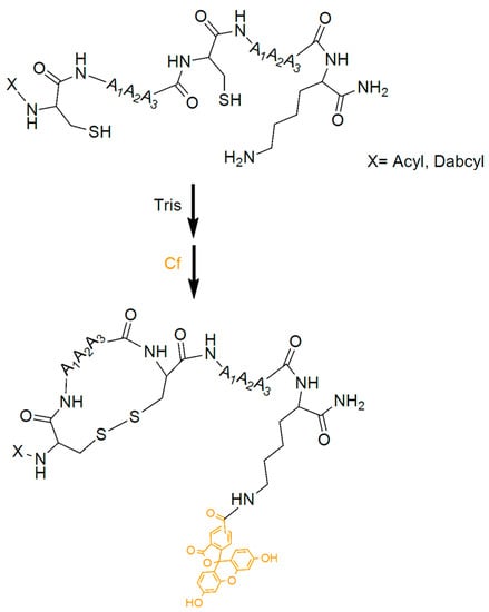 The cyclization that enhances rigidity and stability was already shown to increase the internalization of different peptides [30,33]. The distance between the guanidino groups in linear peptides had a strong effect on the internalization [39], but the same effect can be reached by cyclization without the incorporation of other amino acids [40]. In this work, the effect of different cyclization—disulfide bond formation and with different rigid aromatic scaffolds—was examined in combination with the Dabcyl group on the internalization of short oligoarginine-containing peptides. The influence of the position of oligoarginines on internalization was also investigated.