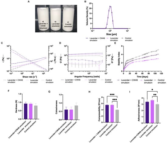 (A) (a) Lavender–CW49 peptide emulsion with a concentration of 0.25% w/w of essential oil and 0.2 µg/mL of CW49 peptide, (b) lavender emulsion with a concentration of 0.25% w/w of essential oil, and (c) control emulsion (without the active components). Rheological characterization: (B) droplet-size distribution of the emulsions. Mean size: lavender emulsion: 1.11 μm, lavender–CW49-peptide emulsion: 1.11 μm, and control emulsion: 1.08 μm. (C) Flow curve of stress τ vs. shear rate (continuous line) and viscosity η vs. shear rate (discontinous line) at 0.1–200 s−1. (D) Frequency sweep analysis of emulsions at 0.01–1 Hz, continuous lines correspond to storage modulus G′ and discontinuous lines correspond to loss modulus G″. (E) Stability of the emulsions by stability index. Textural analysis of the lavender–CW49-peptide emulsion, lavender emulsion, and control emulsions: (F) hardness, (G) cohesiveness, (H) compressibility, and (I) adhesiveness. (one-way ANOVA. (***) corresponds to p < 0.001, (**) to p < 0.01 and (*) p ≤ 0.05.
