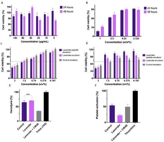 Cytotoxicity assays: (A) MTT assay results for the CW49 peptide (100, 80, 50, 20, 10, and 5 μg/mL) at 24 and 48 h. (B) MTT assay results for the lavender essential oil (1, 0.5, 0.25, and 0.125% w/w) at 24 and 48 h. (C) MTT assay results for the CW49–lavender emulsion, lavender emulsion, and control emulsion (3, 1.5, 0.75, 0.375, and 0.187% v/v) at 24 h. (D) MTT assay results for the CW49–lavender emulsion, lavender emulsion, and control emulsion (3, 1.5, 0.75, 0.375, and 0.187% v/v) at 48 h. Biocompatibility assays of the lavender–CW49-peptide emulsion with a concentration of 0.25% w/w of essential oil and 0.2 µg/mL of CW49 peptide, lavender emulsion with a concentration of 0.25% w/w of essential oil, and the control emulsion (without the active components). In the hemolysis assay (E), Triton X-100 was used as the positive control, while PBS 1X was the negative one. In the platelet aggregation assay (F), plasma rich in platelets (PRP) was employed as the negative control and Thrombin (6U) as the positive one. (****) corresponds to p < 0.0001.