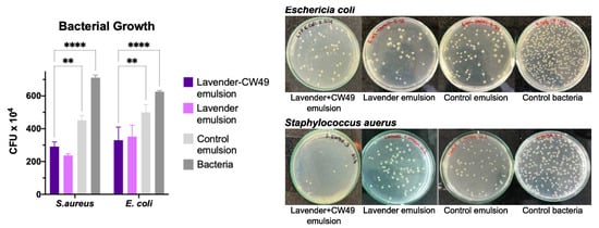 Antibacterial activity of the CW49–lavender emulsion, lavender emulsion, and control emulsion and bacteria (CFU × 104) by agar diffusion assay and counts of colony-forming- units (CFUs) tested in Escherichia coli (E. coli) ATCC 25922, and Staphylococcus aureus (S. aureus) ATTC 23235. The positive control was bacteria grown in phospate buffer. (****) corresponds to p < 0.001 and (**) p < 0.01. Statistically significant differences were for p < 0.05.