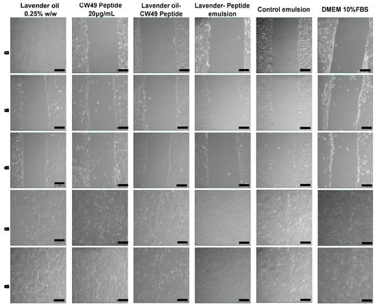 To assess the regenerative potential of the active compounds and the developed emulsions, a wound-healing model was performed on a 2D cell layer of human keratinocytes. The lavender oil, the CW49 peptide, a combination of lavender oil–CW49 peptide, the lavender–peptide emulsion, and the control emulsion were evaluated in this model (Figure 4 and Figure 5). Exposing keratinocytes to the CW49 peptide promoted migration and wound healing, consistent with previous studies due to the upregulation of angiogenic proteins, such as hypoxia-inducible factor (HIF)-1, endothelial nitric oxide synthase (eNOS) and inducible nitric oxide synthase (iNOS), and the inhibition of excessive inflammation []. Notably, H. Liu et al.’s study conducted an in vivo evaluation of the CW49 peptide in mice, determining that the CW49 peptide promotes wound healing with full-thickness dermal wounds in both normal and diabetic animals. Specifically, a thin layer of granulation tissue and a rapid re-epithelialization were observed following the application of the CW49 peptide []. These findings confirmed that the CW49 peptide, at a concentration of 20 µg/mL, was the active compound promoting wound healing in the proposed emulsion. In addition to its tissue-regeneration properties compared to the control, it also represents an appropriate cost–benefit ratio, given its relatively low concentration.