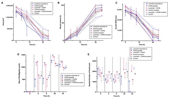 2D Wound-healing assay to evaluate the regenerative potential in a monolayer of human keratinocyte cell line (HaCaT) in a time lapse of 0, 4, 8, 20, and 24 h. The treatments evaluated were lavender essential oil at 0.25% w/w, CW49 peptide at 20 μg/mL, the two active compounds joined: lavender essential oil at 0.25% w/w and CW49 peptide at 20 μg/mL, the lavender–CW49-peptide emulsion, the control emulsion, and the control DMEM medium supplemented with 10% FBS. (A) Scratch area in μm2. (B) Wound closure in %. (C) Scratch width in μm. (D) Rate of cell migration in μ/hour. (E) Standard deviation of the scratch width in μm.