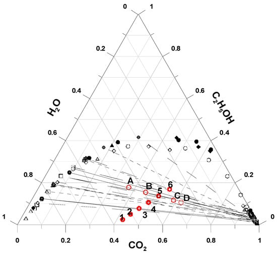 VLE phase diagram for the CO2-water-ethanol ternary mixture [,]: (●) T = 343.2 K, 11.3 MPa; (○) T = 343.2 K, 11.8 MPa; (◆) T = 333.2 K, 10.1 MPa; (◇) T = 333.2 K, 11.8 MPa; (▲) T = 313.2 K, 7.9 MPa; (△) T = 313.2 K, 10.1 MPa; (☐) T = 313.2 K, 10.0 MPa. Symbols of circle (1), (2), (3), (4), (5), and (6) refer to the feed mixture compositions (R = FCO2/Fl = 1.8) at ethanol contents of 10%, 20%, 30%, 40%, 50%, and 60% (w/w), respectively. Symbols (A), (B), (C), and (D) refer to the feed mixture compositions as volume flow ratios of CO2 to 50% (w/w) aqueous ethanol solution (R = FCO2/Fl) of 1.0, 1.4, 2.4 and 2.8, respectively.
