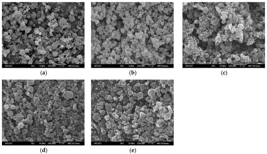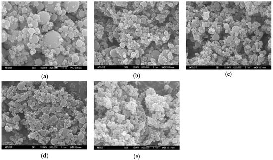 Table 1 lists the particle size of the SAA-derived γ-CD (in terms of dno and d4,3), which was prepared using different solutions (with varying ethanol content (EtOH%, w/w)), γ-CD concentration (CCD), temperatures (precipitator (TP) and saturator (TS)), and flow ratio of CO2 to γ-CD solution (R). As mentioned above, increasing ethanol content in γ-CD solution could reduce its surface tension and viscosity, thus downsizing the γ-CD particles during the SAA process [,,,,]. This was further confirmed by the FESEM images shown in Figure 2. Notably, spherical γ-CD particles were obtained from the SAA process using water as the sole solvent (Figure 2a, ethanol content = 0%). The increase of ethanol content in the γ-CD solution (up to 60%, Figure 2b–e) was found to alter not only the size, but also the morphology of the resultant particles. This can be explained by the increase in the Peclet number (Pe), which contributed to the rapid evaporation of ethanol solvent relative to the diffusion of the solute from the surface. Consequently, less spherical γ-CD particles were produced despite the maintenance of other parameters []. The PSDs of the γ-CD particles prepared with various ethanol contents are shown in Figure 3. Evidently, γ-CD particles were downsized from 1.8 μm to 1.1 μm as the ethanol content in the solution increased from 0 to 60 wt%. Although the presence of ethanol is beneficial for the micronization of particles, the sphericity of the resulting powder, which is directly related to the flowability, is equally important. To obtain sufficiently micronized spherical particles, a solution of 50 wt% aqueous ethanol was used as the solvent, and the effects of the precipitation parameters on the γ-CD particle size were investigated.