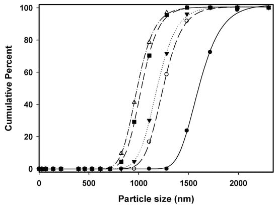 The PSDs of the γ-CD particles produced by SAA at different solution ethanol contents (%, w/w): (●) 0%; (○) 30%; (▼) 40%; (■) 50%; (△) 60%.