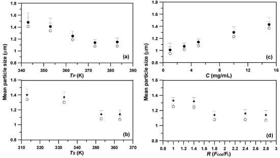 Arithmetic mean size (dno, ○) and mass-weighted mean particle size (d4,3, ●) of the γ-CD particles varying with SAA process parameters of: (a) the temperature of precipitator (TP), (b) the temperature of saturator (TS), (c) the concentration of the γ-CD solution (CHP), (d) the volume flow ratio of CO2 to γ-CD solution liquid (R).