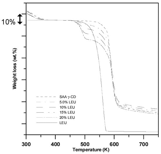 Figure 7 shows the thermogravimetric properties of the SAA-produced γ-CD particles with different LEU content. The as-received LEU was subjected to the same thermal evaluation as the blank study. Evidently, one-stage sublimation occurred at 473–573 K, with all samples decomposing into the gas phase (△m = 100%); these results confirmed the low thermal stability of LEU. Similar results were obtained by Li et al. [], thereby confirming the instability of LEU during heat treatment. Based on this characteristic, the LEU content of each γ-CD particle was accurately computed from the weight removed at 573 K. Compared with the bare γ-CD particles (Figure 7), the LEU contents of the 5.0, 10, 15, and 20 wt% γ-CD–LEU carrier particles were 5.1 ± 0.5, 9.8 ± 0.3, 14.9 ± 0.3, and 19.8 ± 0.4%, respectively, which are highly consistent with the LEU formulations (CLEU) in Table 2.