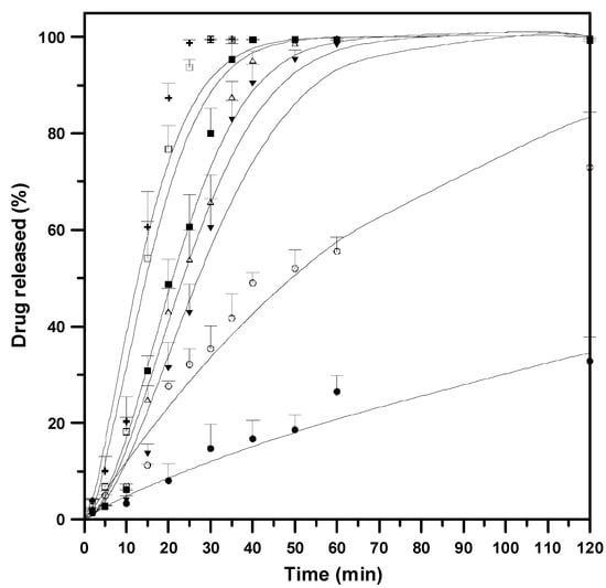 Dissolution profiles of drug-carrier composites powder varying with different γ-CD/drug mass ratio (Z): (●) unmodified BDP, #B1; (○) physical mixture, ZPM = 10; (▼) Z = 10, #B3; (△) Z = 15, #B4; (■) Z = 20, #B5; (◻) Z = 30, #B6; (+) Z = 35, #B7.