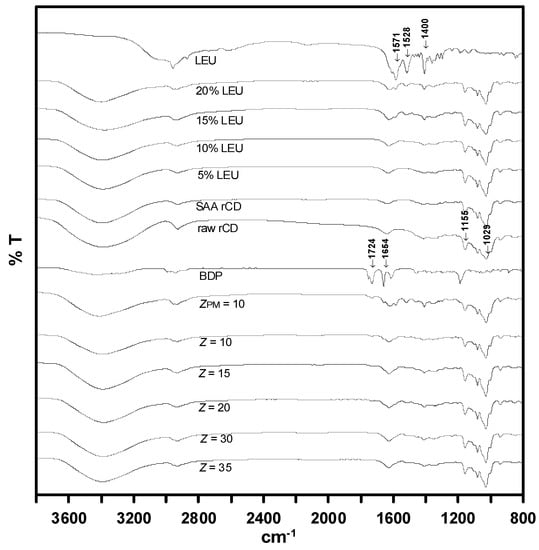The FTIR spectra presented in Figure 12 constantly displayed absorption spectrums which peaked at 1155 and 1029 cm−1, respectively, for all samples. Such absorption bands could be assigned to C–O and C-H groups in γ-CD, and could therefore emerge in all the measured samples. On the other hand, absorption related to LEU can be observed at 1571 and 1400 cm−1, which signify the presence of asymmetric and symmetric stretching modes of COO– ion group in the composite. Meanwhile, the peak at 1528 cm−1 could be prompted by the N–H+ stretching upon excitation during IR scanning. As for BDP, the stretching activities of its conjugated and non-conjugated C=O can be traced from the bands peaked at 1724 and 1654 cm−1, respectively. Interestingly, the characteristic bands of γ-CD, LEU and BDP were only observable in the spectrum of the physically mixed sample (ZPM = 10), whereby those of BDP are found absence in the drug–γ-CD composite particles. This could be attributed to how the C=O stretching bands of BDP were restricted by inclusion within the cavity of γ-CD.
