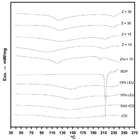 Significantly, the DSC results of the SAA-derived drug-carrier composites samples were presented in Figure 13. The embedment of the guest molecule (drug) in the cyclodextrin cavity or the formation of an inclusion complex causes the disappearance of or shift in the melting point of the guest drug []. Based on the results, the BDP drug undergoes melting at 213 °C, whereas γ-CD in amorphous phase exhibits a broad endothermic peak from 50–150 °C, plausibly arisen from its dehydration process. Similar broad dehydration endothermic peak of γ-CD was inherited by the physically mixed sample in conjunction to the slight reduction of BDP melting point to 205 °C. This can be explained by the partial interaction between BDP and γ-CD during physical mixing, which reduces the crystallinity of the drug. This is not uncommon, as a similar melting point reduction was also observed in the β-CD/salbutamol composites produced by the physical mixing method []. With the same mass ratio of Z = 10, BDP melting peak almost disappeared in the SAA-derived BDP–γ-CD composites compared with the physically mixed sample (ZPM = 10). This could be related to high amorphous phase in the sample, indicated by the XRD patterns in Figure 11. An increase in Z value rendered the samples more amorphous, thereby further enhancing the dissolution rate of BDP during drug delivery. This is supported by the results obtained in the dissolution experiment.