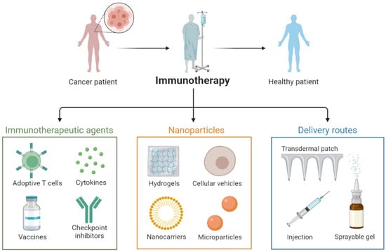 There are several types of nucleic-acid-mediated immunotherapeutics for the treatment of cancer, including immune stimulators (nucleic acids derived from pathogen-related molecular patterns) and plasmid, mRNA, aptamer, and immune modulators that act through gene regulatory mechanisms. Innate immunity is triggered by the recognition of immune stimulators and pathogen-associated molecular patterns (PAMPs) [21]. Furthermore, plasmids and mRNA can be used to encode and induce the biosynthesis of proteins and peptides which modulate anticancer immune responses (e.g., PD-L1 and STAT1 mRNA) [22,23,24]. In addition, nucleic acid tools for gene editing, suppressing, and activating systems can be engineered to enhance anticancer immunotherapeutic responses. Aptamers can trigger anticancer immune responses and promote the efficacy of immunotherapy [25]. Aptamers consist of single-stranded DNA or RNA oligonucleotides (ODNs) with a 3D folding that has a high specificity and affinity towards their targets [26]. Aptamers prevent alpha-toxin-induced cytolysis and activate TNF-α and IL-17 (AT-27, AT-33, AT-36, and AT-49) [27]. The target cells for various classes of nucleic acid immune modulators are broad, potentially including APCs, effector cells, and tumor cells. Approaches for delivering nucleic acid agents to these target cells need to address the need for biocompatibility and overcome the barriers encountered in therapeutic application (i.e., bioavailability, cellular uptake, and sub-cellular distribution). There are several components (active agents, delivery vehicles, and route of administration) for a wide variety of immunotherapies for cancer (Figure 1).