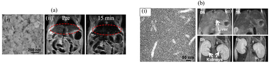 Recently, Marasini et al. developed a dual-modal T1 and T2 MRI contrast agent by coating Gd2O3 NPs (mean particle diameter = 2 nm) with polyaspartic acid (PASP) (Mw = ~9900 amu) using the one-pot polyol method [111]. The TEM image is presented in Figure 7b(i). The synthesized NPs exhibited high r1 and r2 values of 19.1 and 53.7 mM−1s−1 (r2/r1 = 2.8) at 3 T, respectively. After intravenous injection of PASP-coated Gd2O3 NPs into the mice tails, T1 and T2 contrasts were observed in the T1 and T2 MR images of the mouse livers at 3 T, respectively (Figure 7b(ii)). This result showed that dual-modal T1 and T2 MRI contrast agents prepared using Gd2O3 NPs could be obtained by choosing the appropriate hydrophilic polymers as surface-coating ligands, such as the PASP used in this study.