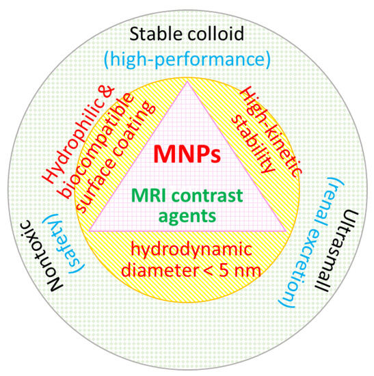 It is critical that MNPs should be nontoxic for biomedical applications [113,114]. Because MRI contrast agents are generally intravenously injected, it is preferred that MNPs are excreted through the renal system rather than the hepatobiliary pathway because the hepatobiliary excretion is relatively slow and MNPs could decompose during the excretion process, which would be toxic to the body. For example, free Gd3+ ions liberated from Gd chelates into the body could cause NSF [22,29,30]. For renal excretion, MNPs should be ultrasmall with hydrodynamic diameters less than 5 nm [115,116,117] because the glomerular filtration diameter in the kidneys is 4.5–5 nm [115]. It is also essential that the kinetic stability of MNPs is high so that they do not decompose until they are excreted through the renal system as urine.