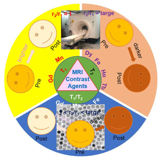 Conventional MRI contrast agents can serve as either T1 or T2 MRI contrast agents. However, the introduction of T1 and T2 dual-modal MRI contrast agents has enabled more accurate diagnosis of disease via complementary T1 and T2 MR images [65,66,67,68,69,70,71]. Dual-modal MR images can be easily obtained by changing the operational mode of the same MRI scanner, unlike other dual-modal imaging techniques (such as MRI-CT, CT-PET, and MRI-PET) that require a combination of two different imaging machines that are expensive, inconvenient, and time-consuming.