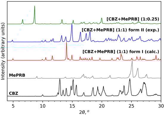 The bulk powder sample of form II of the [CBZ + MePRB] (1:1) cocrystal was produced via stirring a slurry of stoichiometric amounts of the components in 0.5–0.8 mL of acetonitrile or dichloromethane for 3 days at room temperature. The resulting solid phase was separated from the solvent by vacuum filtration. The residual solvent was allowed to evaporate at room temperature and under reduced pressure for 6–8 h. Form I of the [CBZ + MePRB] (1:1) cocrystal was prepared according to the procedure described by Sugden et al., using n-heptane as a solvent [].